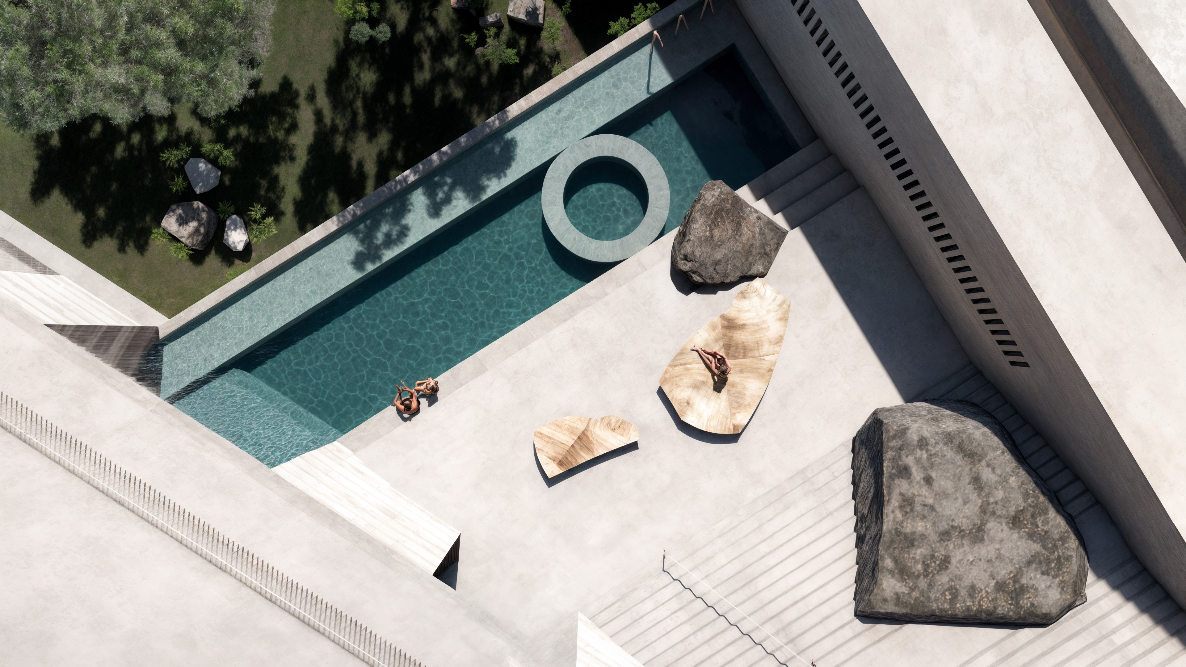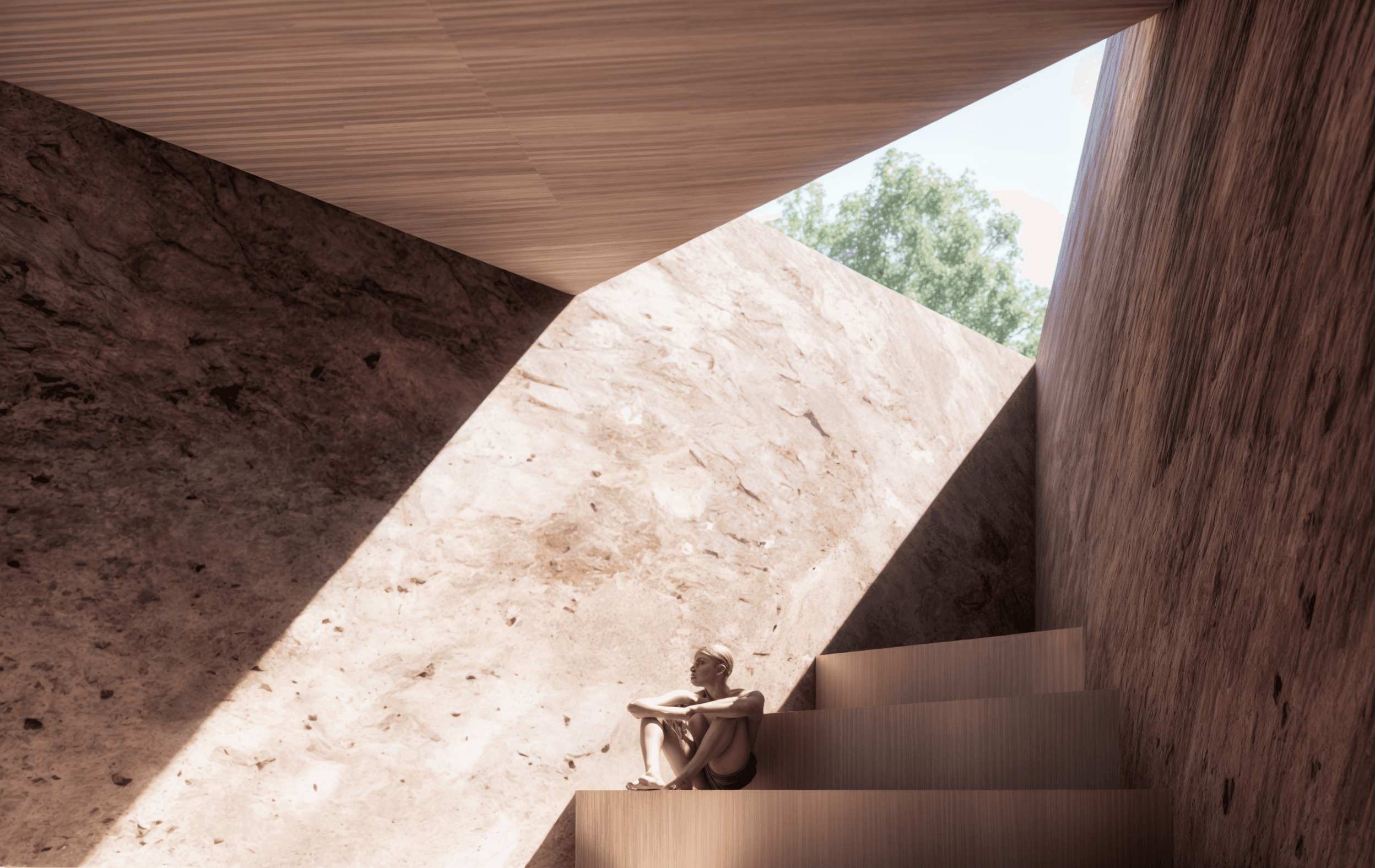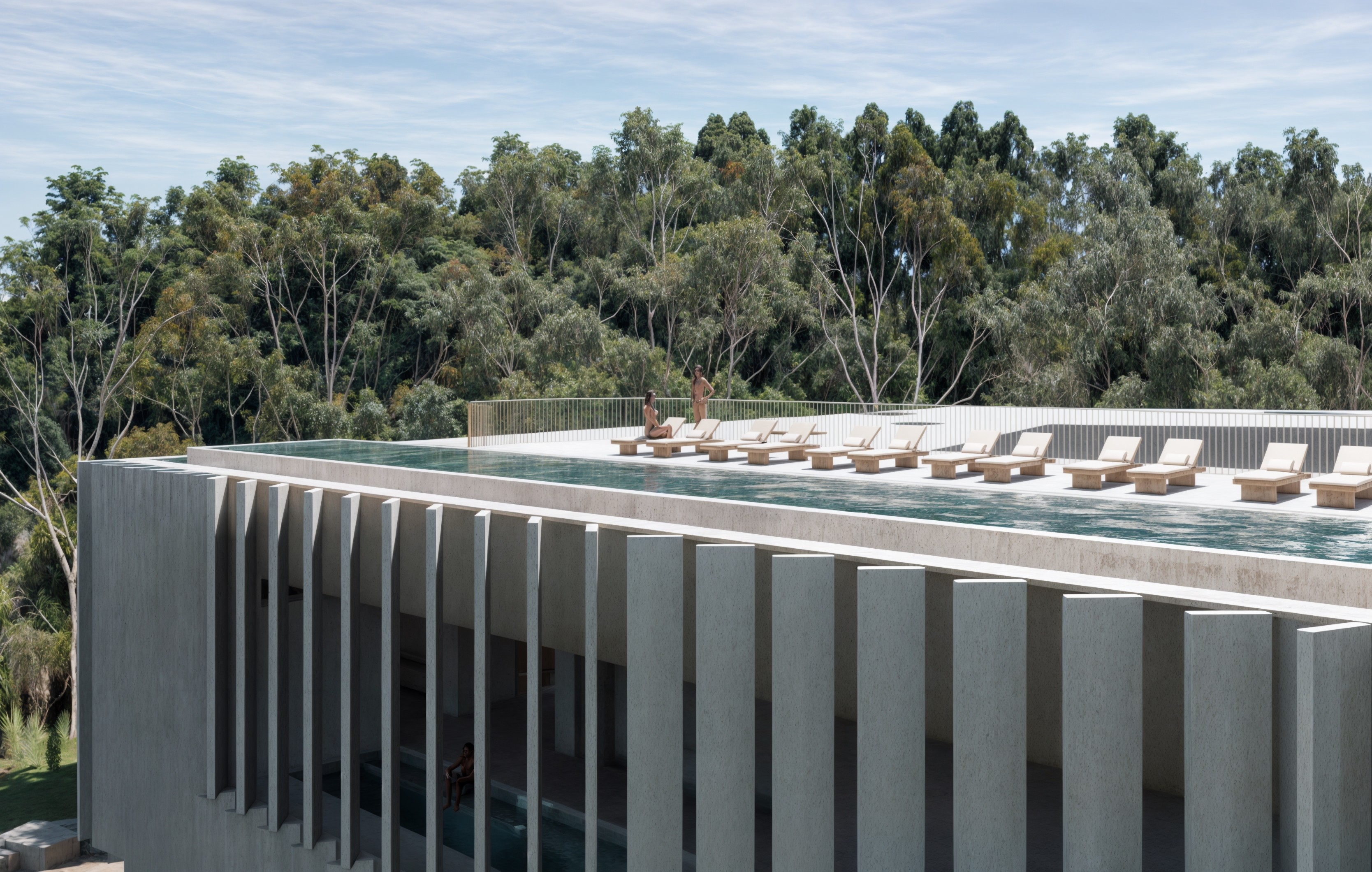 Tawarri Baths is a contemporary geothermal retreat situated along the historic foreshore of Dalkeith. Informed by the slow erosion of limestone, the building is carved around a central planted gorge—an open void that connects each level through light, water, and landscape. Across 4,400m² of enclosed and open-air space, the experience unfolds as a procession: from shaded pools and wellness rooms, to rooftop waterlines and river-edge gardens.