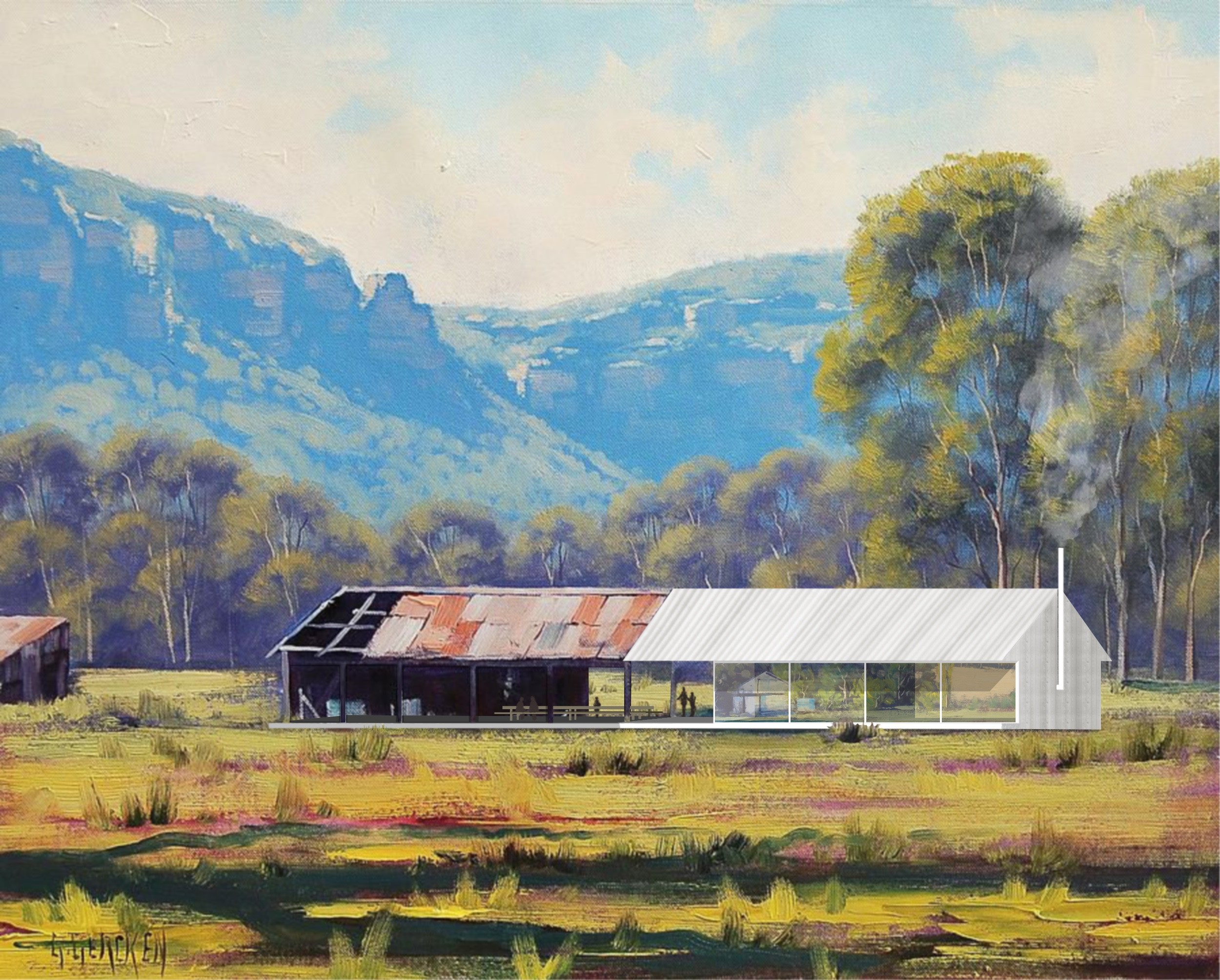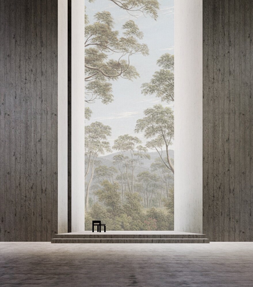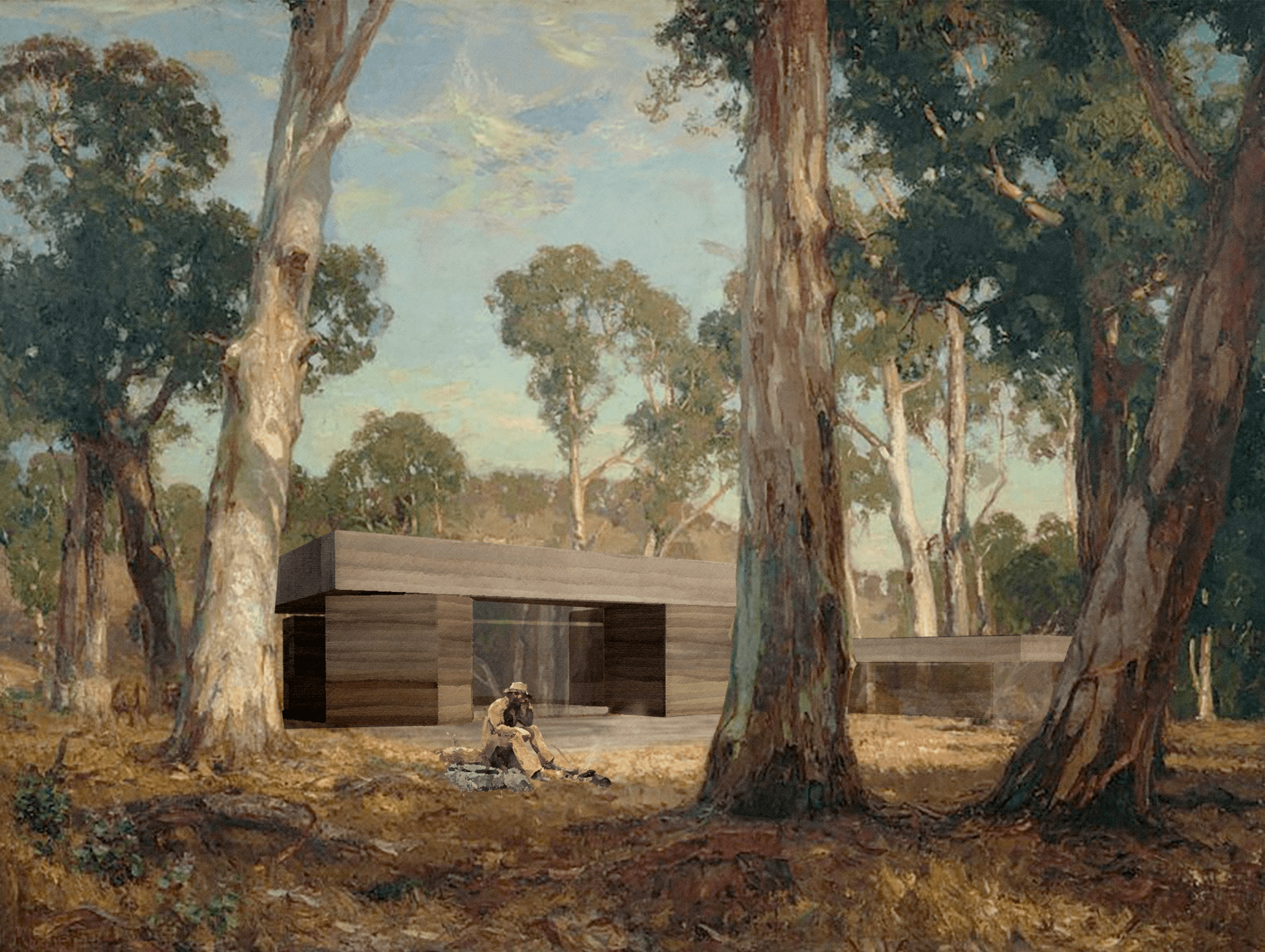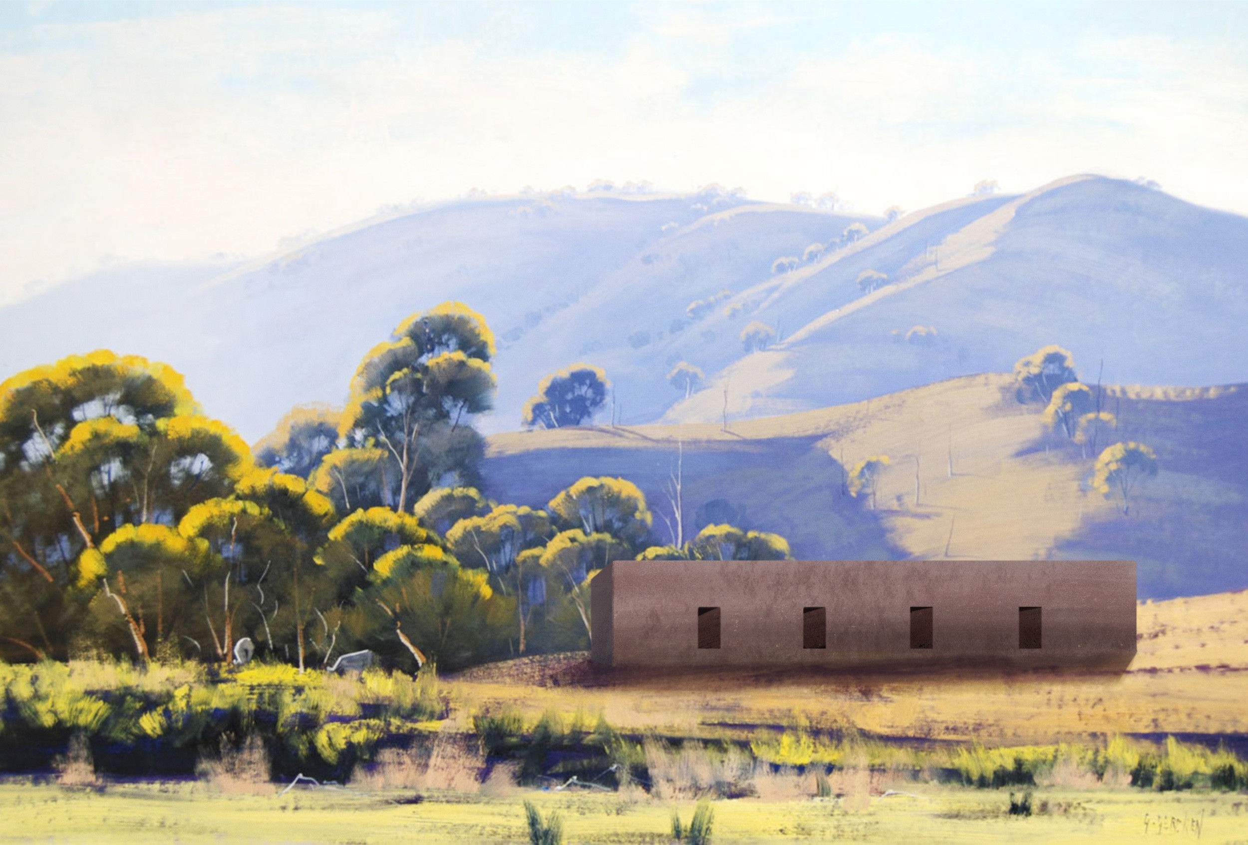 The architecture I sketch into these paintings attempts to co-exist within this experience. It responds not only to the landscape but to the connection of place that the artist felt in that moment.