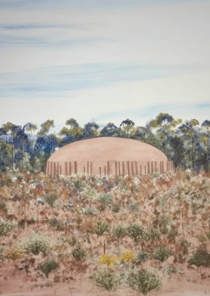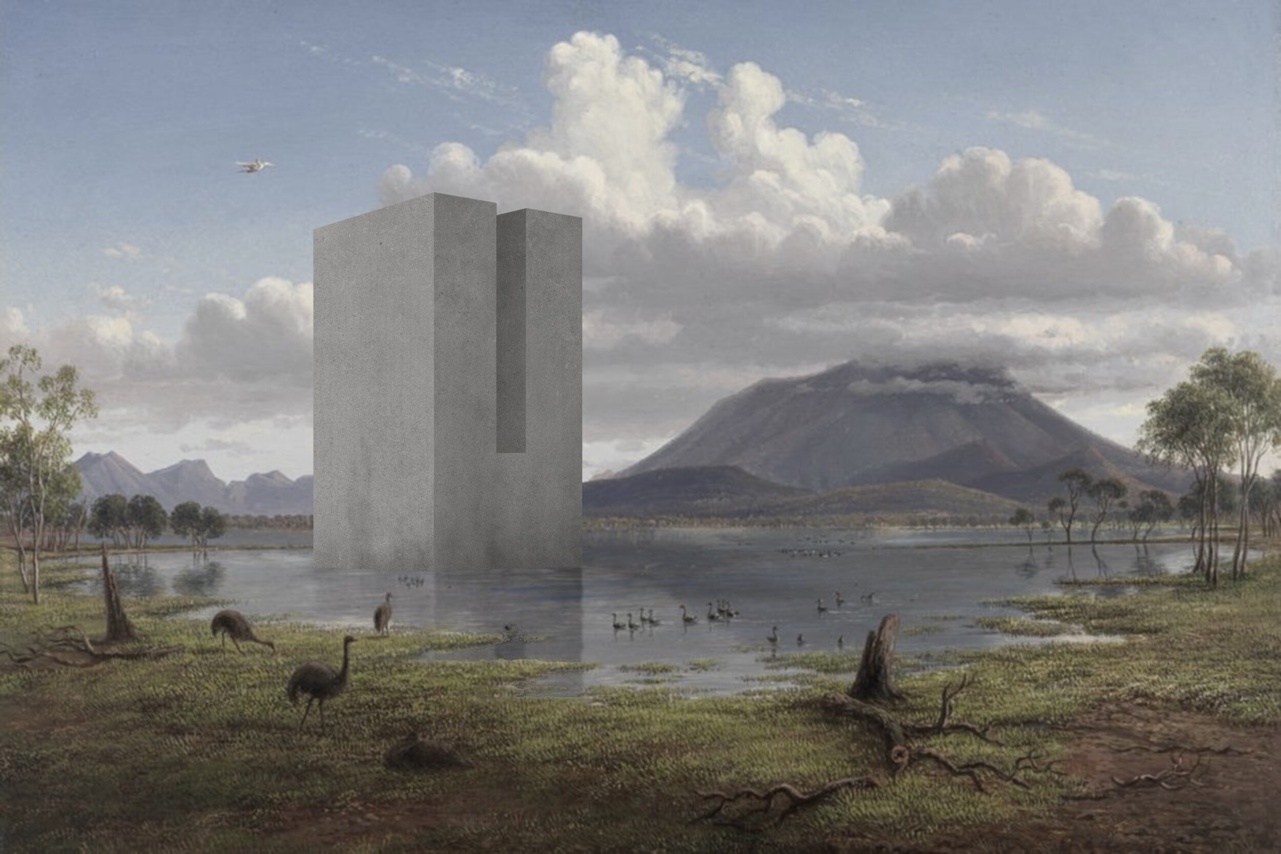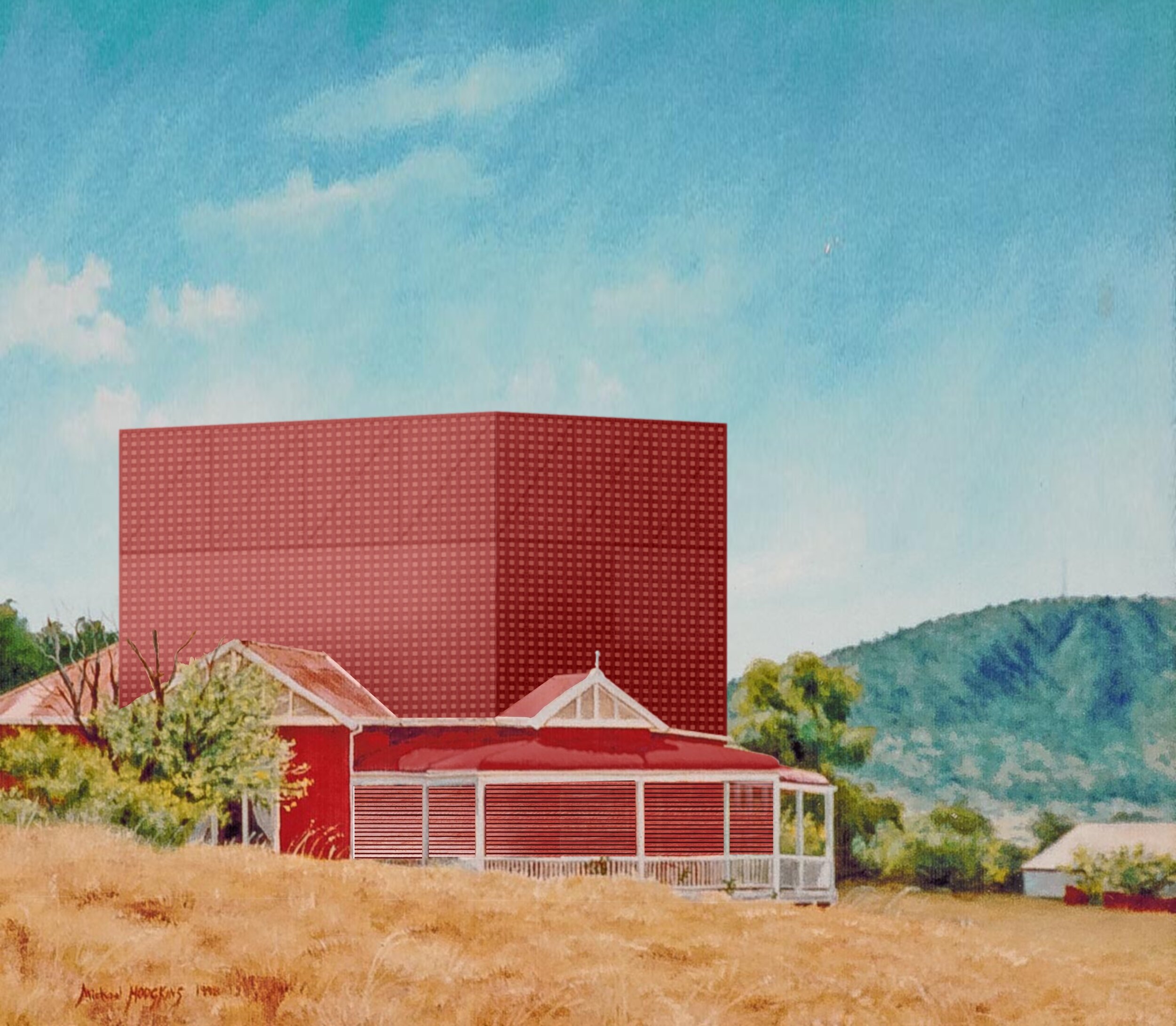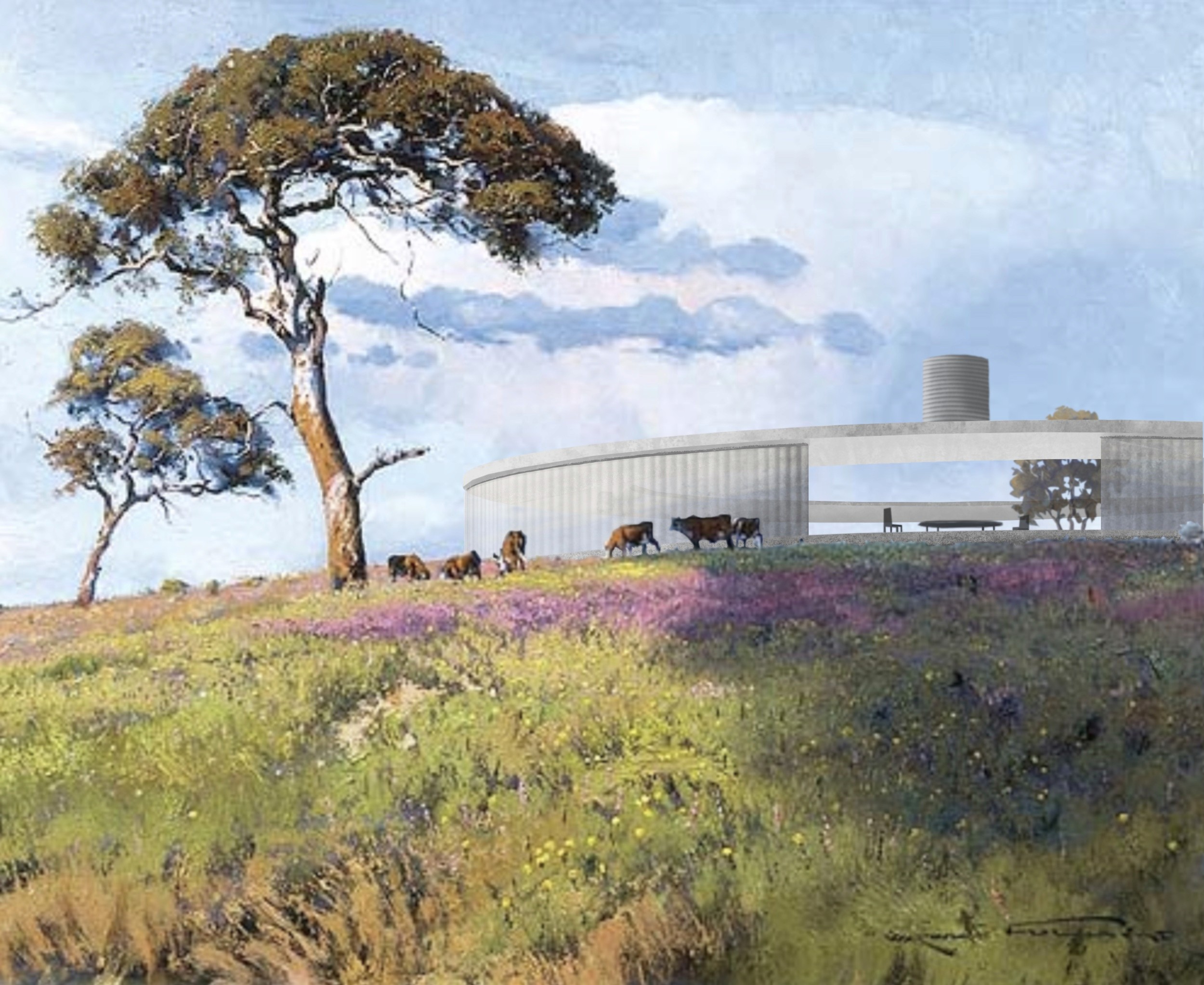 The architecture I sketch into these paintings attempts to co-exist within this experience. It responds not only to the landscape but to the connection of place that the artist felt in that moment.