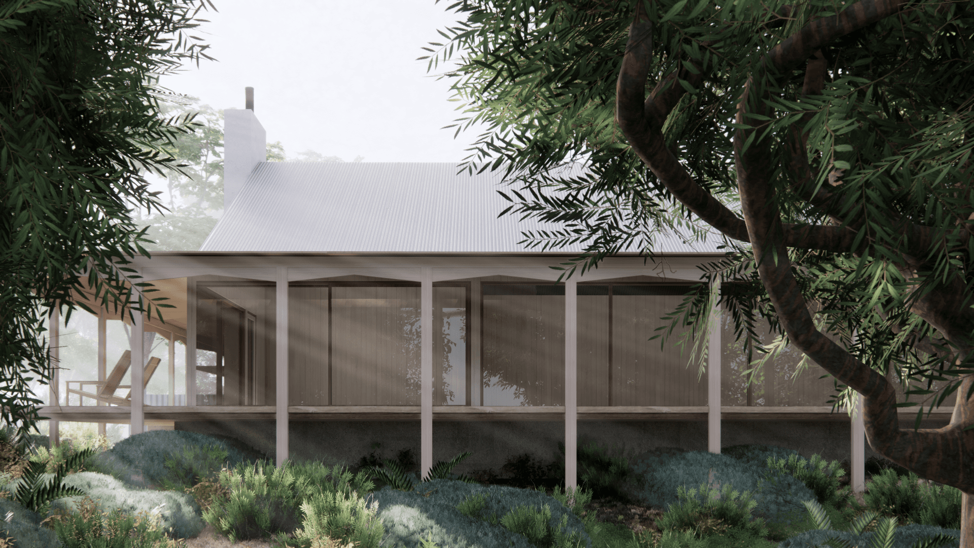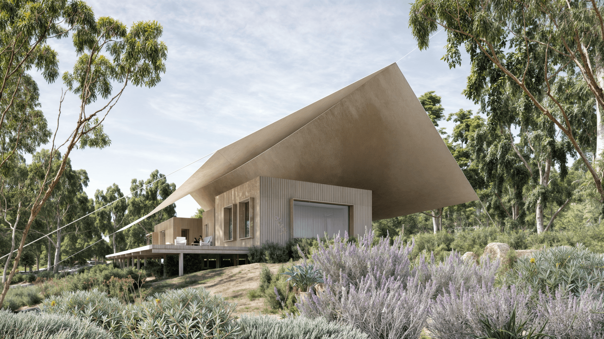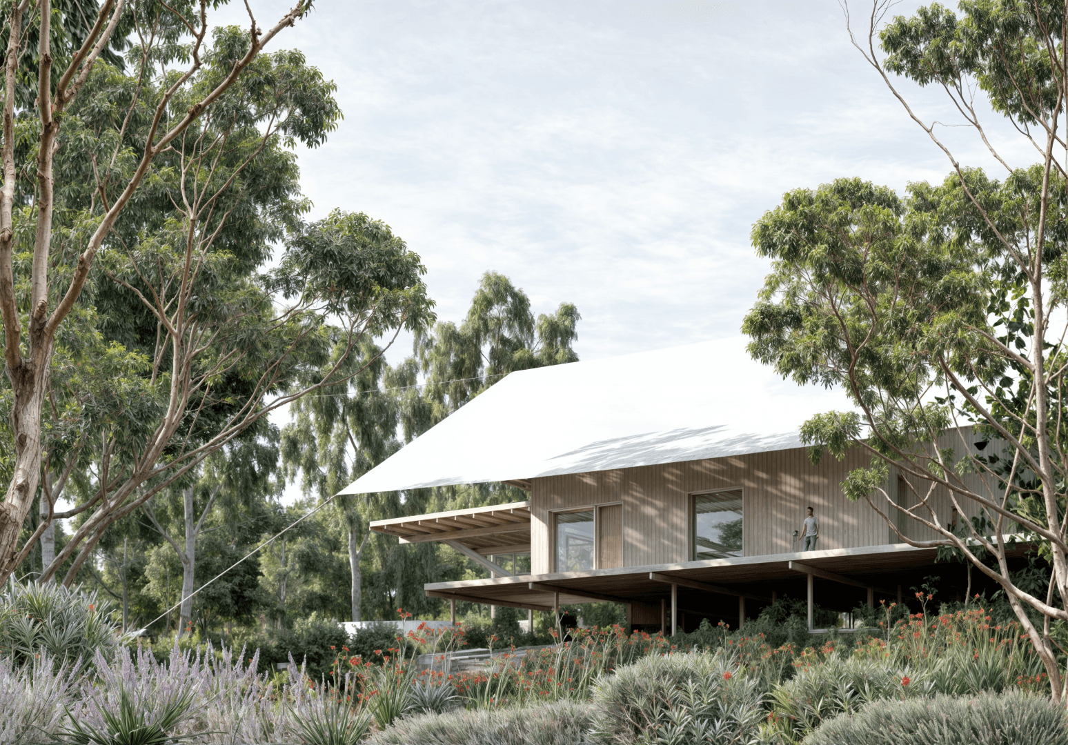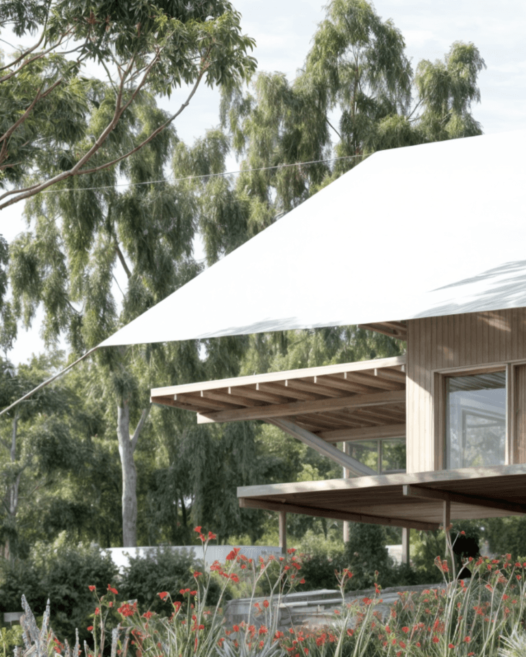 Tent House is a lightweight, elevated dwelling shaped by the Australian bush—its vast canopy roof floats above timber-lined rooms, offering shade, stillness, and connection to land.
