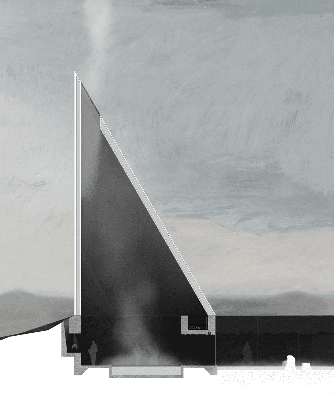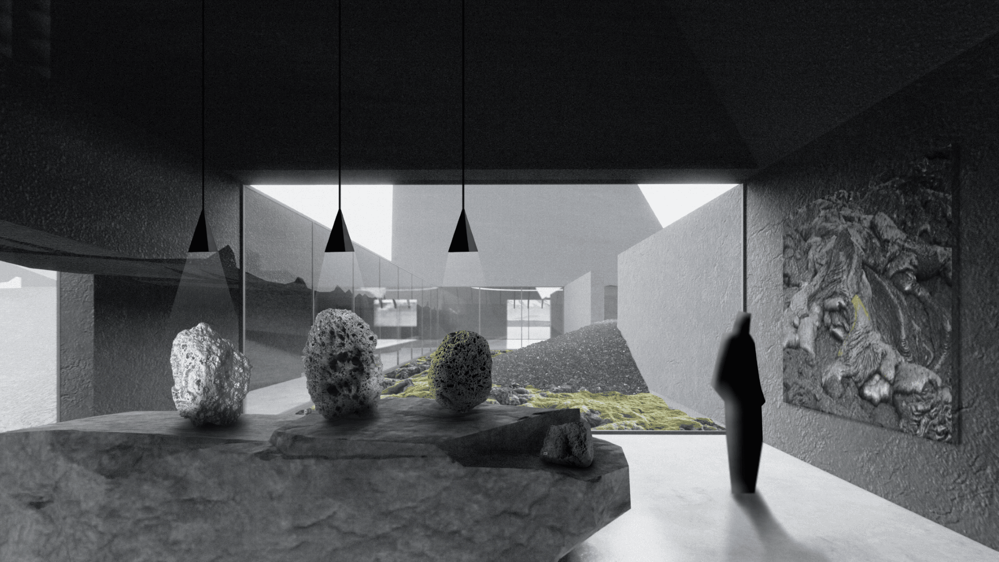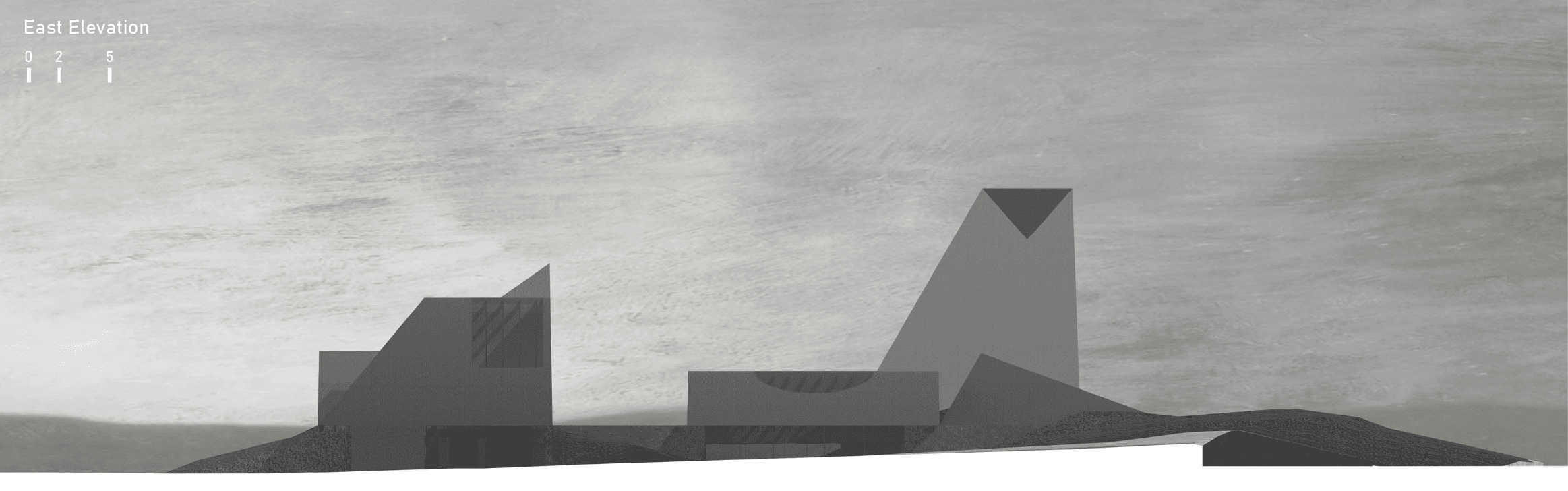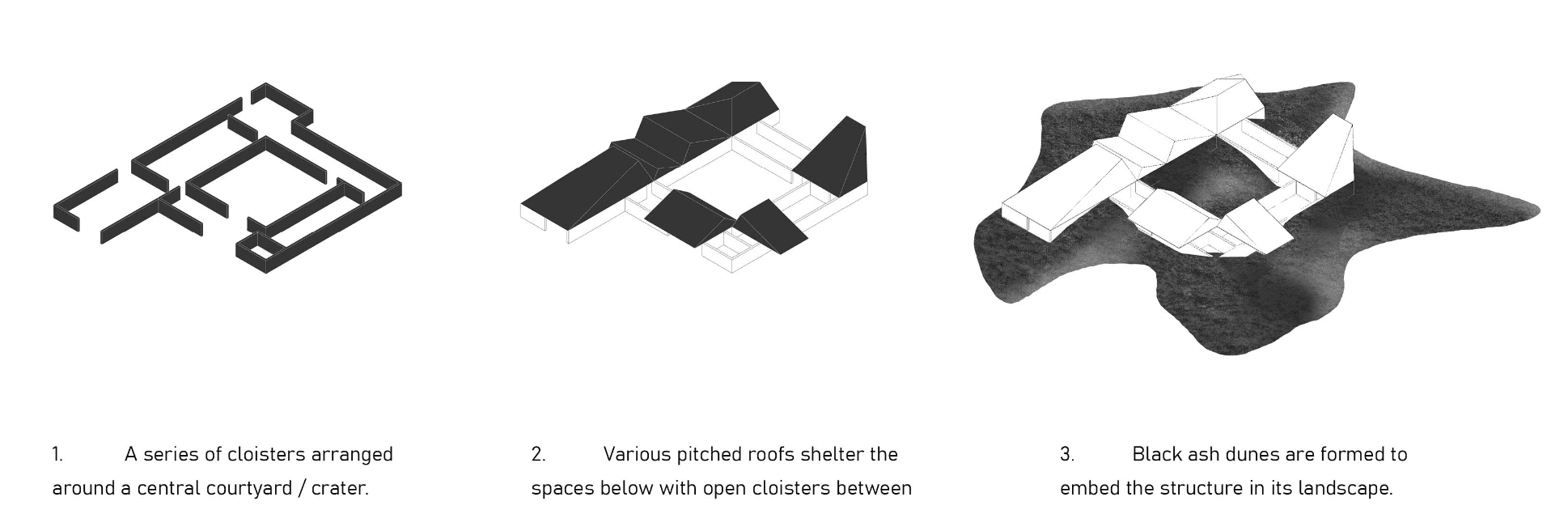 This proposal is part Eldfell homage and architectural experiment by way of carving within a post-landscape topography where a museum of pitched roofs is blanketed by black ash dunes as though it’s been buried beneath a plume of a volcano eruption such as the near-by Hverfjall. The form creates a tension as the museums silhouette mimics the mountainous landscape with the affecting domestic emotions of the humble pitched roof - evoking the buried homes of Eldfell. It’s presence on the horizon provides a landmark of curiosity with an introverted experience within that embeds the explorer beneath the earth, allowing them to regain their own sense of scale.