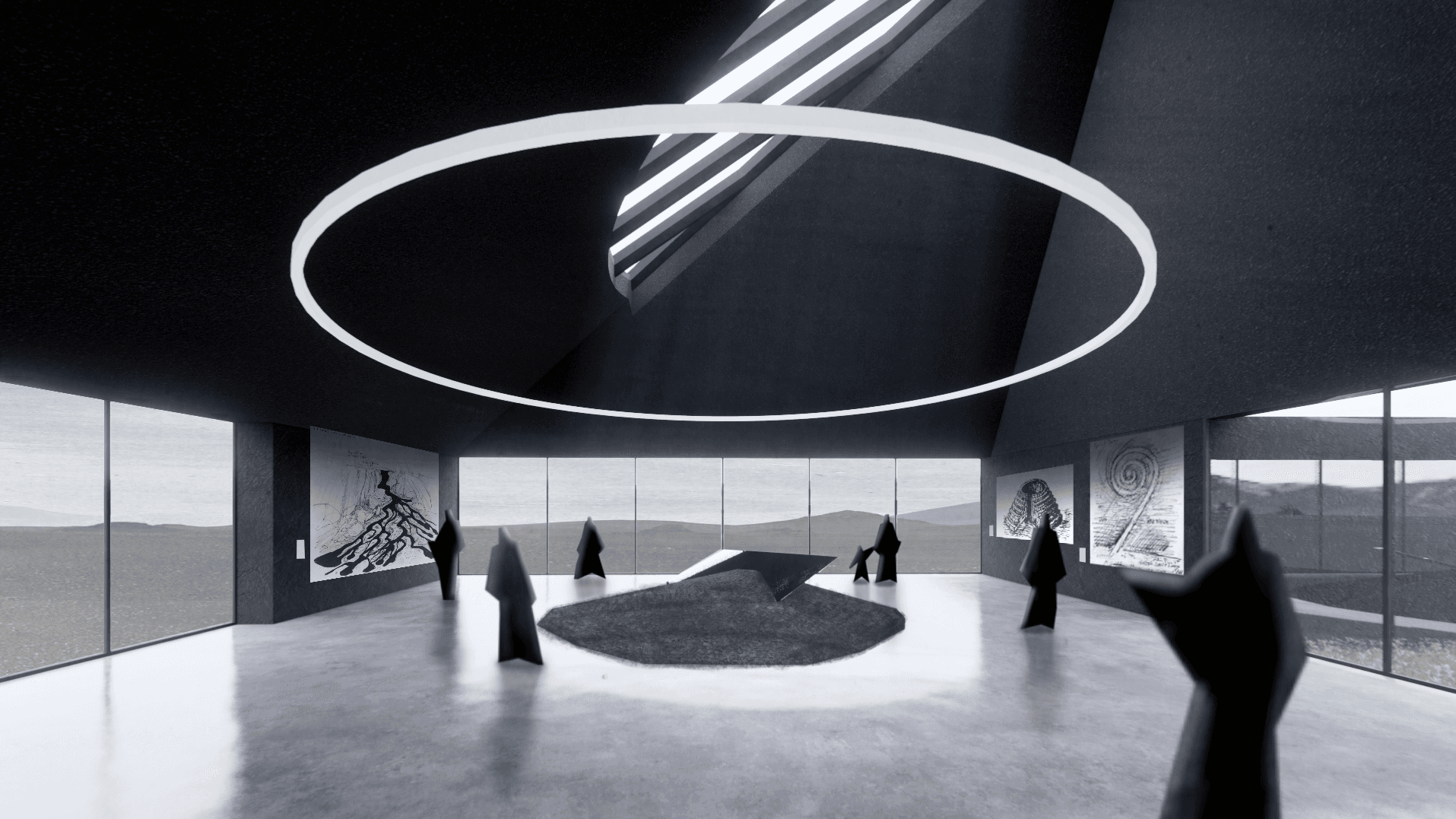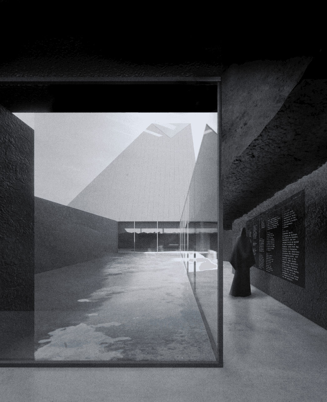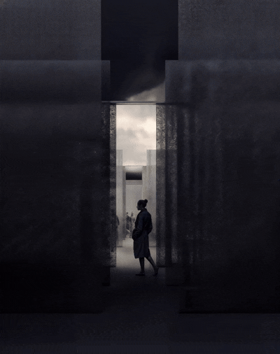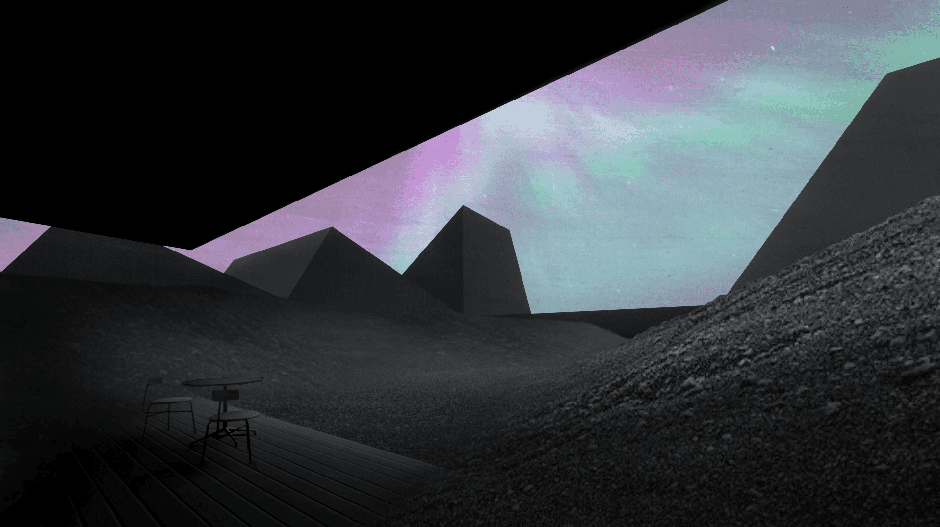 This proposal is part Eldfell homage and architectural experiment by way of carving within a post-landscape topography where a museum of pitched roofs is blanketed by black ash dunes as though it’s been buried beneath a plume of a volcano eruption such as the near-by Hverfjall. The form creates a tension as the museums silhouette mimics the mountainous landscape with the affecting domestic emotions of the humble pitched roof - evoking the buried homes of Eldfell. It’s presence on the horizon provides a landmark of curiosity with an introverted experience within that embeds the explorer beneath the earth, allowing them to regain their own sense of scale.