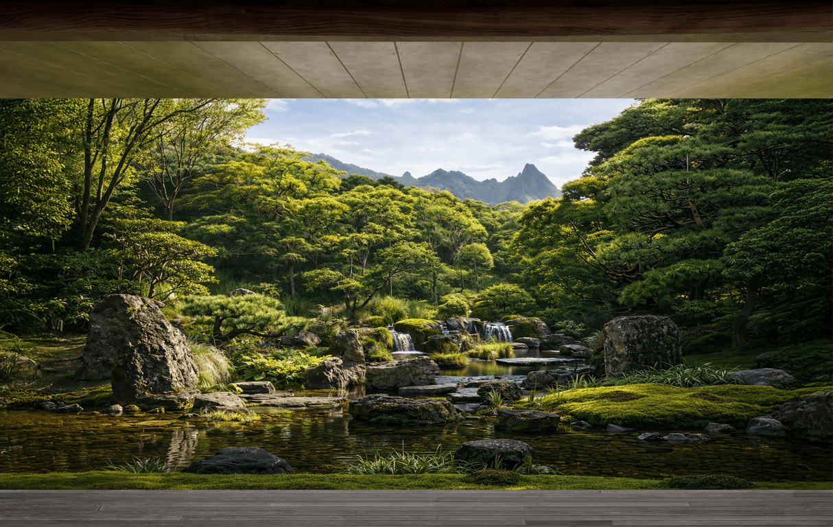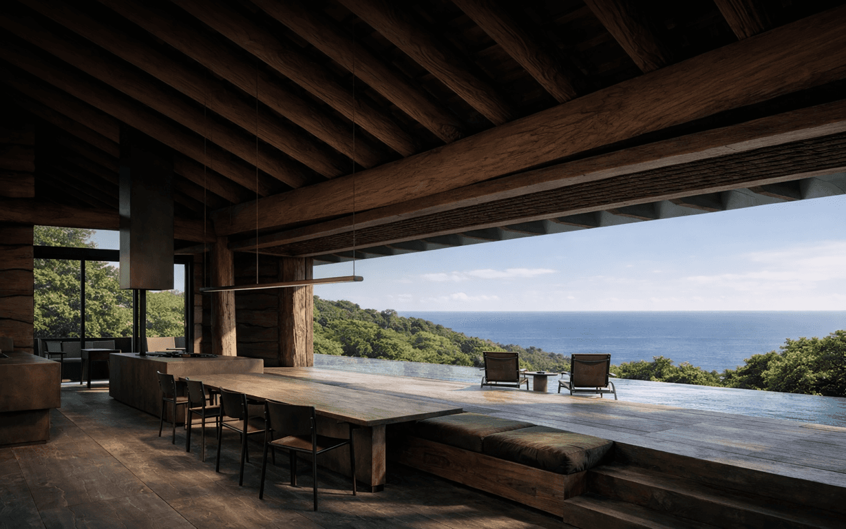 A restrained cedar log house that rests lightly on Yakushima’s granite terrain, framing ocean, forest, and water.