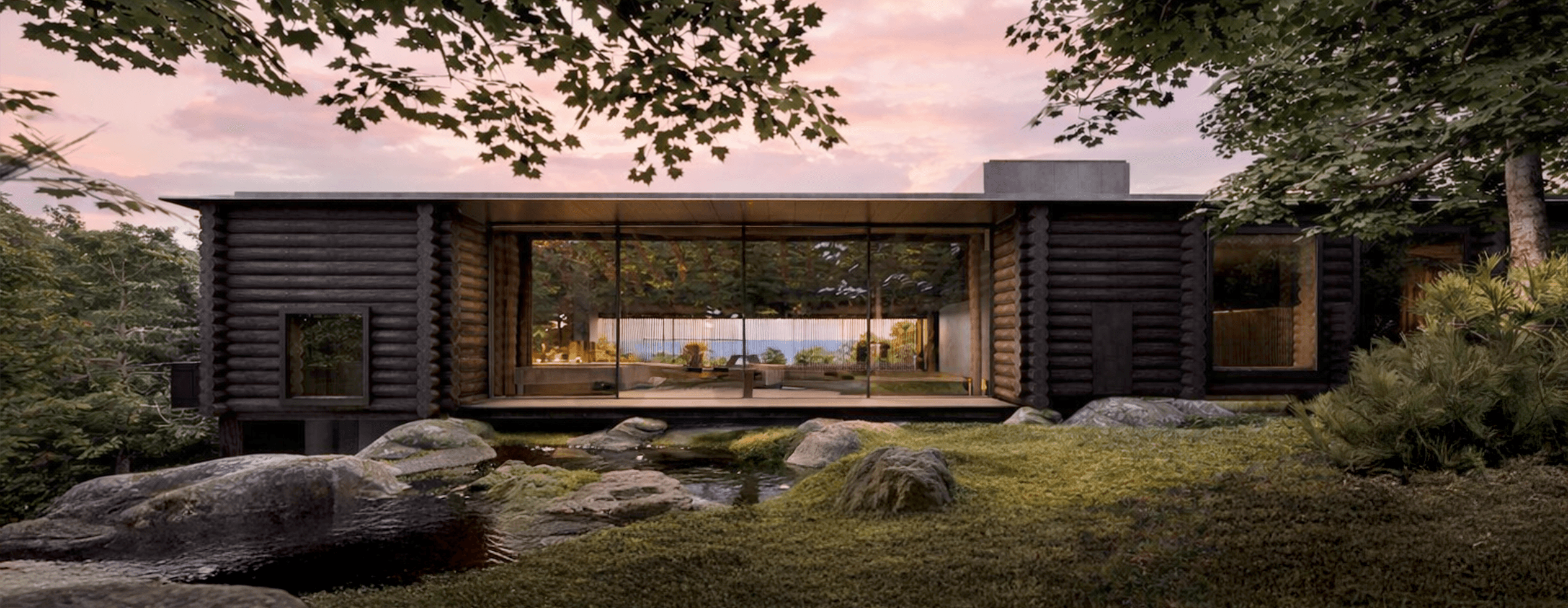 The house is conceived as a long cedar log structure that follows the natural contours of the terrain. Resting lightly on existing granite boulders, the building minimises disturbance while framing expansive views toward the ocean to the south and forested mountains to the north. A stream running through the site is retained and incorporated into a cultivated garden, reinforcing the relationship between architecture, water, and landscape.